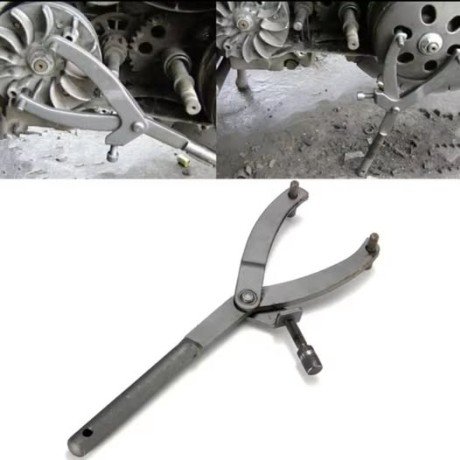 Cette clé universelle est conçue pour immobiliser les parties rotatives de la transmission d’un scooter, permettant ainsi le desserrage ou le serrage des écrous centraux sans risque de dommage.