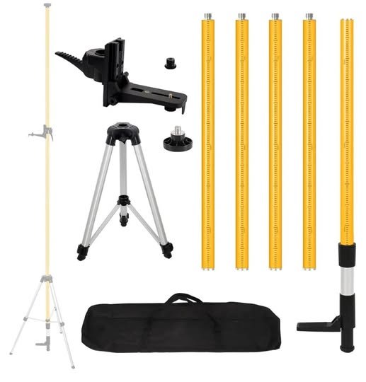 L’image présente un kit complet de mesure pour chantier, composé d’un trépied réglable, d’une mire graduée (règle télescopique) et de plusieurs accessoires de fixation.